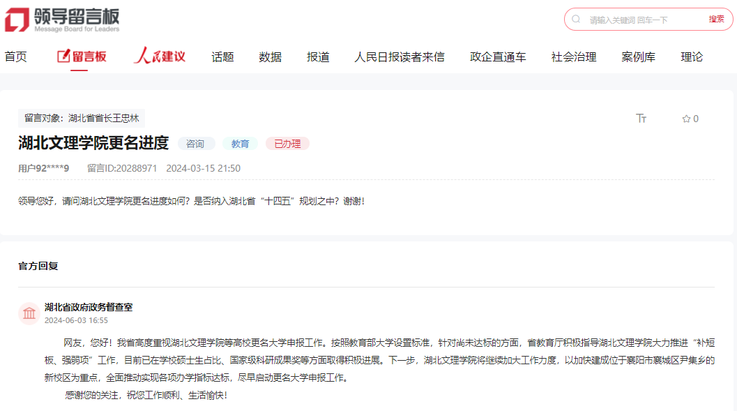 2024年3月,有網(wǎng)友通過人民網(wǎng)領(lǐng)導(dǎo)留言板咨詢“湖北文理學(xué)院更名大學(xué)的進(jìn)展”,湖北省政府政務(wù)督查室回復(fù)表示:“目前已在學(xué)校碩士生占比、國家級科研成果獎等方面取得積極進(jìn)展。下一步,湖北文理學(xué)院將繼續(xù)加大工作力度,以加快建成位于襄陽市襄城區(qū)尹集鄉(xiāng)的新校區(qū)為重點,全面推動實現(xiàn)各項辦學(xué)指標(biāo)達(dá)標(biāo),盡早啟動更名大學(xué)申報工作。”