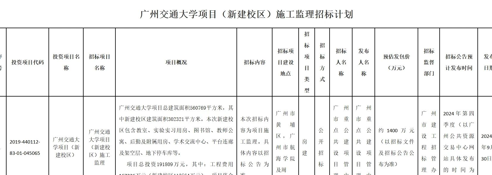 據(jù)招標(biāo)計劃顯示,廣州交通大學(xué)項目總建筑面積560769平方米,其中新建校區(qū)建筑面積302321平方米。項目總投資191809萬元,其中:工程費(fèi)用167226萬元(新建校區(qū)113564萬元)。項目資金來源為市本級基本建設(shè)統(tǒng)籌資金。
