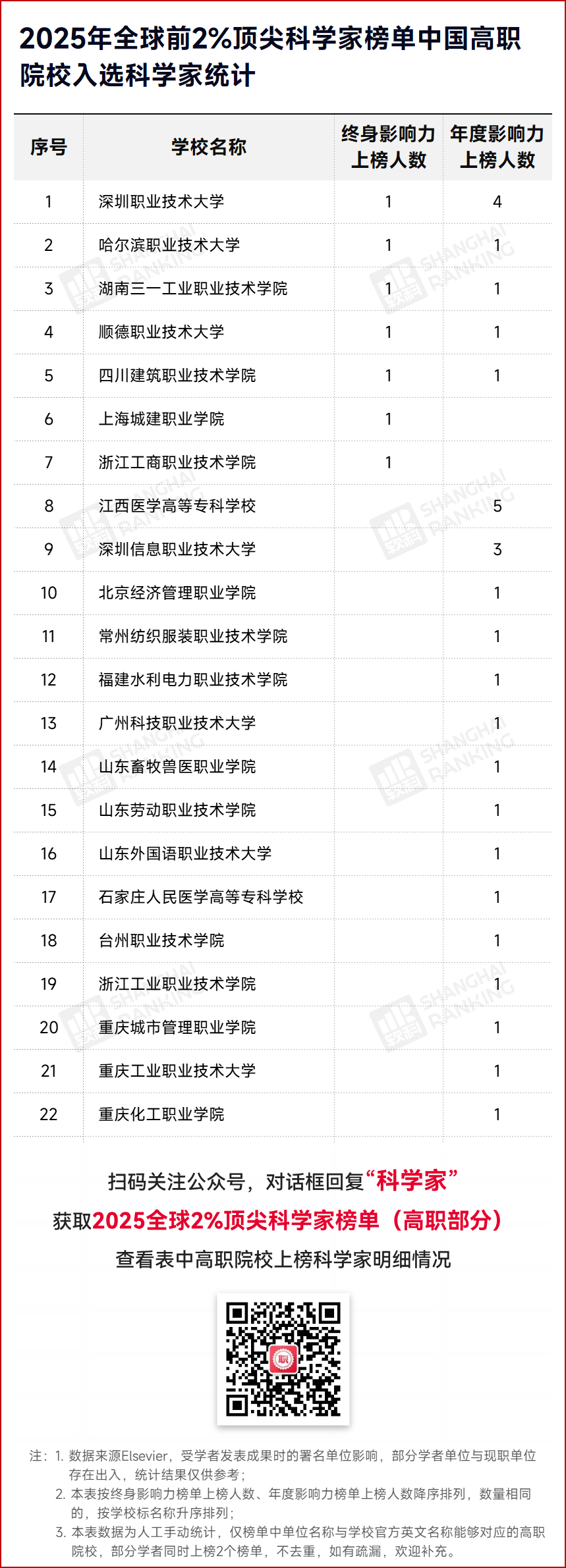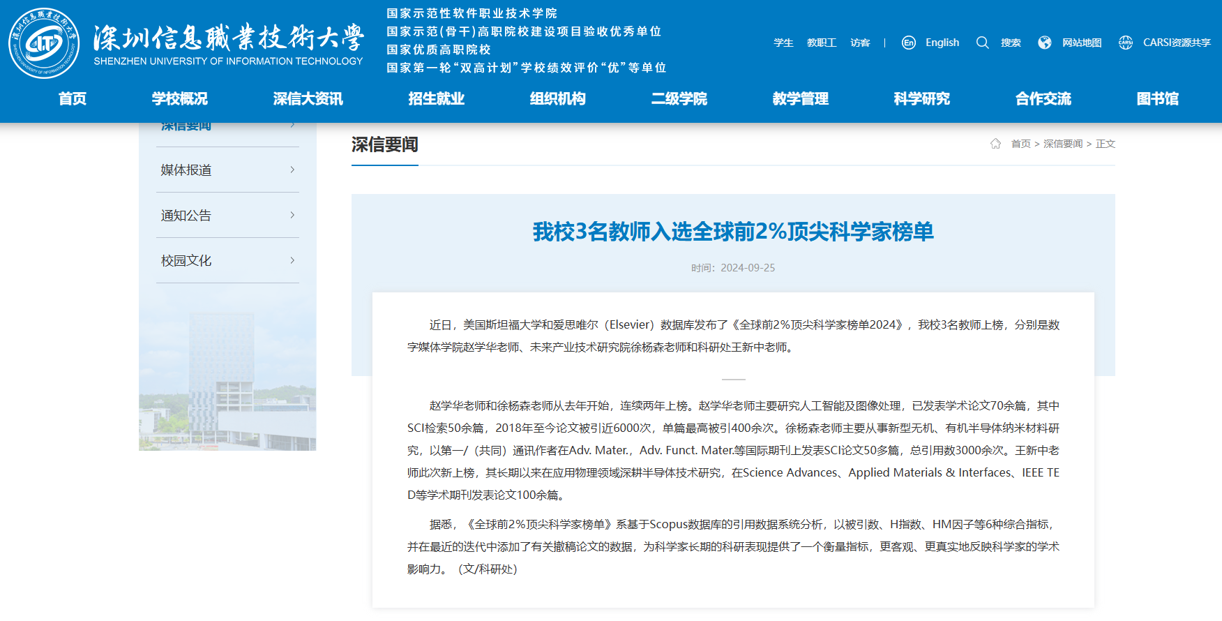 事實(shí)上,2025全球2%頂尖科學(xué)家榜單,并不是高職院校學(xué)者首次上榜。例如,今年剛剛升本的深圳信息職業(yè)技術(shù)大學(xué),學(xué)校教師王新中入選2024年度全球前2%頂尖科學(xué)家榜單,趙學(xué)華、徐楊森2位教師連續(xù)入選2023年、2024年及2025年該榜單。