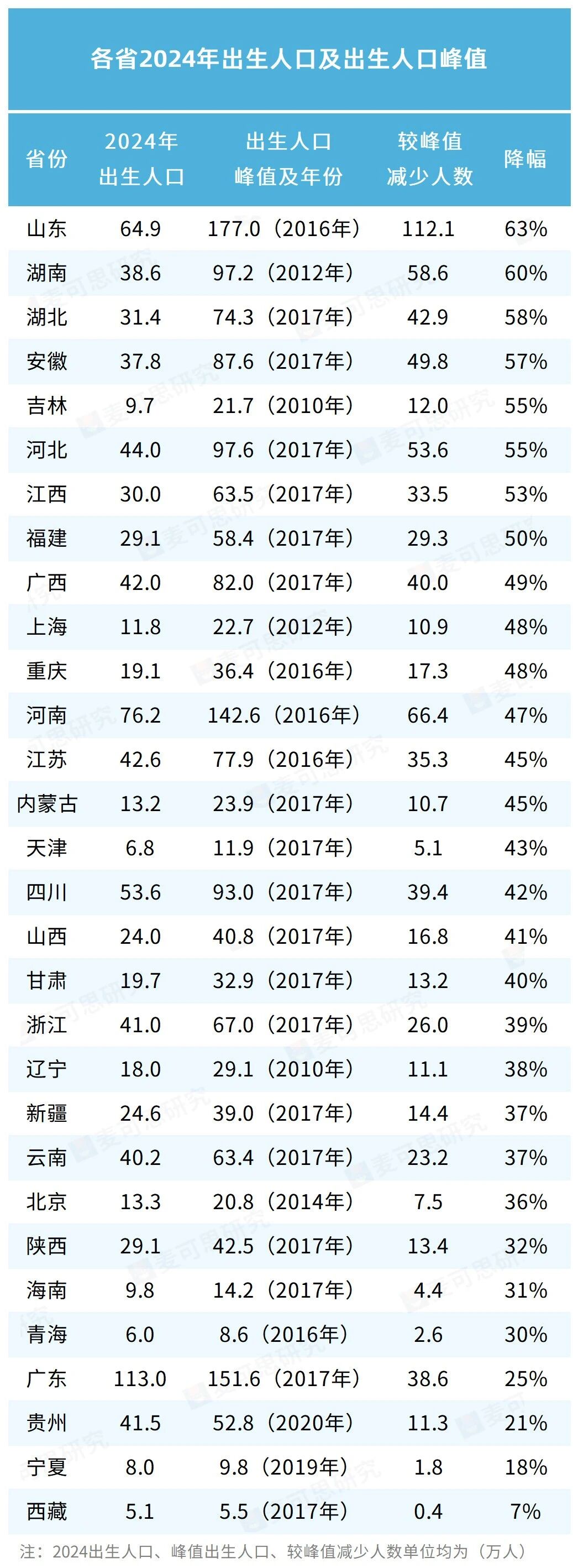 兩湖地區(qū)的出生人口降幅緊隨其后。數(shù)據(jù)顯示,湖南、湖北兩省2024年的出生人口分別是38.6萬、31.4萬,較各自的出生人口峰值分別下降58.6萬、42.9萬,降幅達(dá)到60%和58%。此外,出生人口降幅達(dá)到50%的省份還有安徽、吉林、河北、江西、福建。