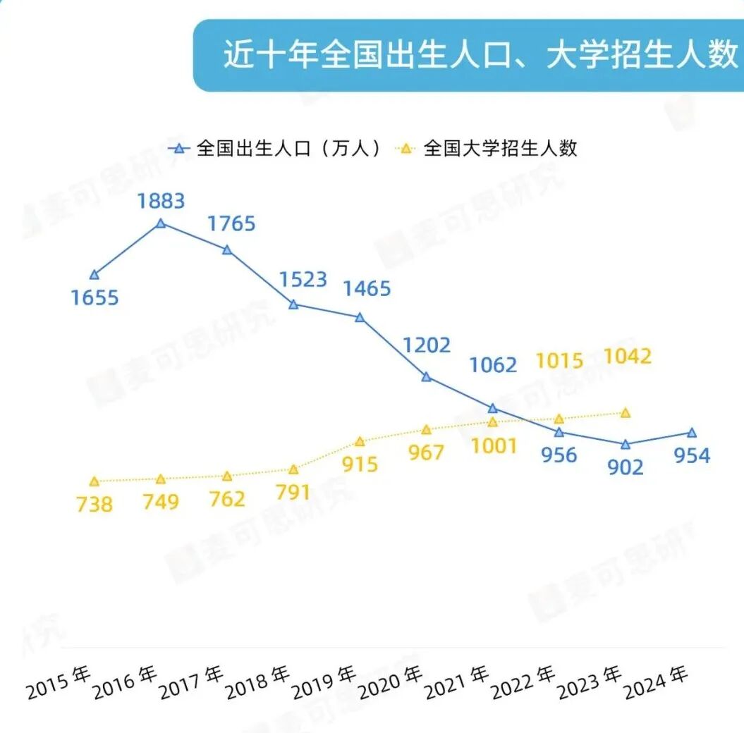 需要注意的是,多省2024年高考招生人數(shù)已經(jīng)超過了本省的出生人口數(shù)量,例如山東2024年高考共錄取81.9萬人,較該省出生人口數(shù)量多17萬人。湖南省同樣,2024年高考招生58.4萬人,多于出生人口(38.6萬)19.8萬人。從全國范圍近十年公布的人口數(shù)據(jù)來看,2024年我國出生人口較峰值(2016年:1883萬人)減少929萬人,新生人口減少將近一半。與此同時(shí),高校招生數(shù)目前仍在逐年增長,2022年的大學(xué)生招生數(shù)已經(jīng)超過當(dāng)年的出生人口數(shù)。