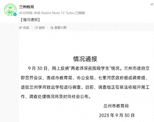最新的消息是,針對(duì)網(wǎng)上反映“兩老師深夜圍毆學(xué)生”情況,蘭州市政府立即召開(kāi)會(huì)議,責(zé)成市教育局、市公安局、七里河區(qū)政府組成調(diào)查組進(jìn)駐蘭州學(xué)府致遠(yuǎn)學(xué)校進(jìn)行調(diào)查。目前,調(diào)查組正在依法依規(guī)開(kāi)展工作,調(diào)查處理情況將及時(shí)向社會(huì)公布。