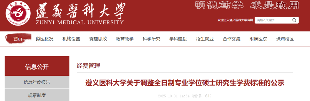 10月31日,遵義醫(yī)科大學發(fā)布《關(guān)于調(diào)整全日制專業(yè)學位碩士研究生學費標準的公示》,根據(jù)省教育廳2025年3月下發(fā)的《省教育廳關(guān)于進一步完善我省全日制專業(yè)學位碩士研究生學科分類學費標準及有關(guān)事宜的通知》有關(guān)精神,學校經(jīng)研究決定,擬在不超過文件規(guī)定的學科分類學費標準內(nèi)調(diào)整現(xiàn)有全日制專業(yè)學位碩士研究生有關(guān)專業(yè)學費標準。