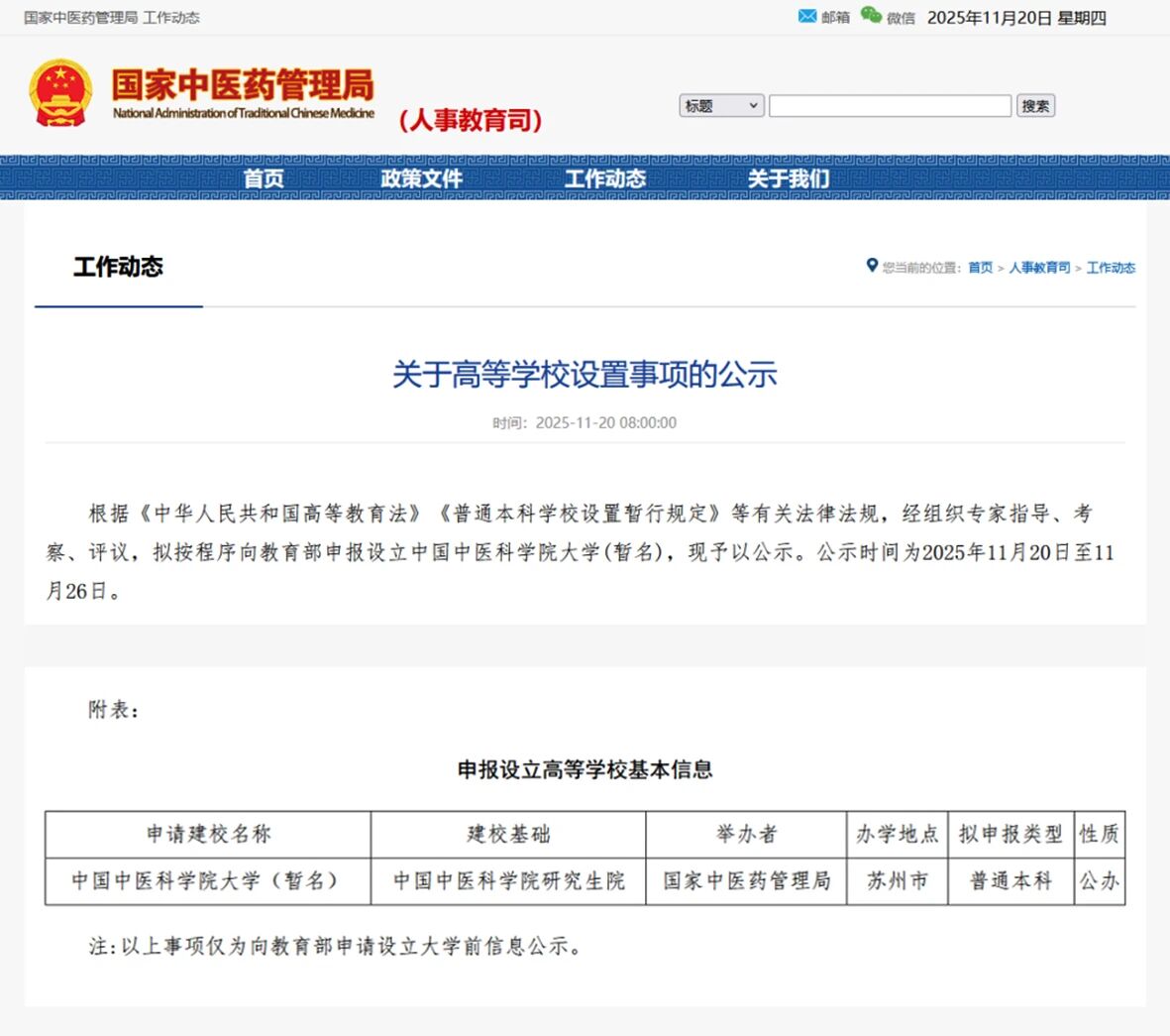 11月20日,國家中醫(yī)藥管理局發(fā)布《關(guān)于高等學(xué)校設(shè)置事項(xiàng)的公示》,指出擬向教育部申報(bào)設(shè)立中國中醫(yī)科學(xué)院大學(xué)(暫名)。