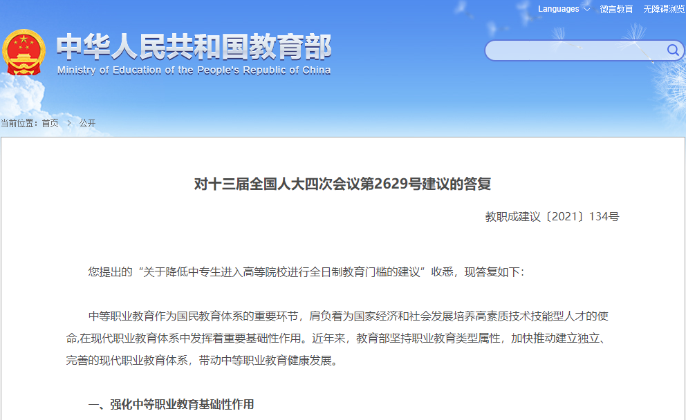 答復(fù)中提到:強(qiáng)化中等職業(yè)教育基礎(chǔ)性作用;暢通中職畢業(yè)生學(xué)歷提升通道。