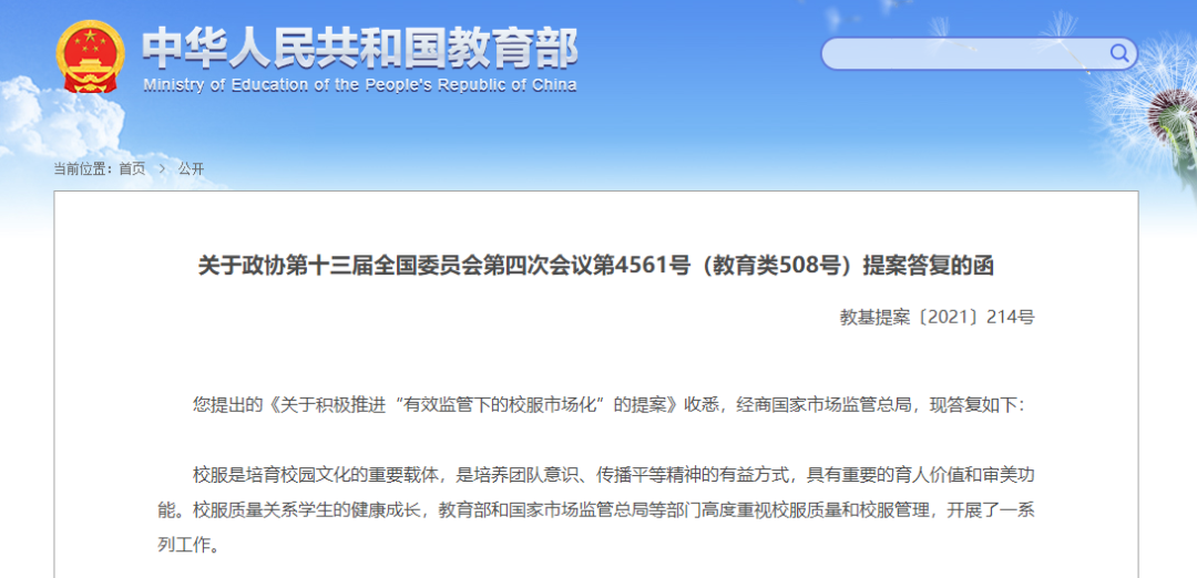 近日,教育部官網(wǎng)公布了《關(guān)于政協(xié)第十三屆全國(guó)委員會(huì)第四次會(huì)議第4561號(hào)(教育類508號(hào))提案答復(fù)的函》,對(duì)《關(guān)于積極推進(jìn)“有效監(jiān)管下的校服市場(chǎng)化”的提案》進(jìn)行了答復(fù)。