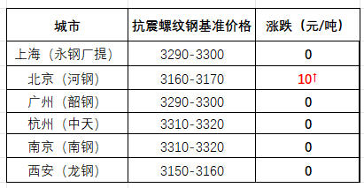 截至午間,國(guó)內(nèi)部分市場(chǎng)螺紋鋼(抗震)基價(jià)如下:上海市場(chǎng)3290-3300元/噸;北京市場(chǎng)3160-3170元/噸;廣州市場(chǎng)3290-3300元/噸;杭州市場(chǎng)3310-3320元/噸;南京市場(chǎng)3310-3320元/噸;西安市場(chǎng)3150-3160元/噸。環(huán)比來(lái)看,截至午間收盤,全國(guó)主要市場(chǎng)一線品牌價(jià)格穩(wěn)定。