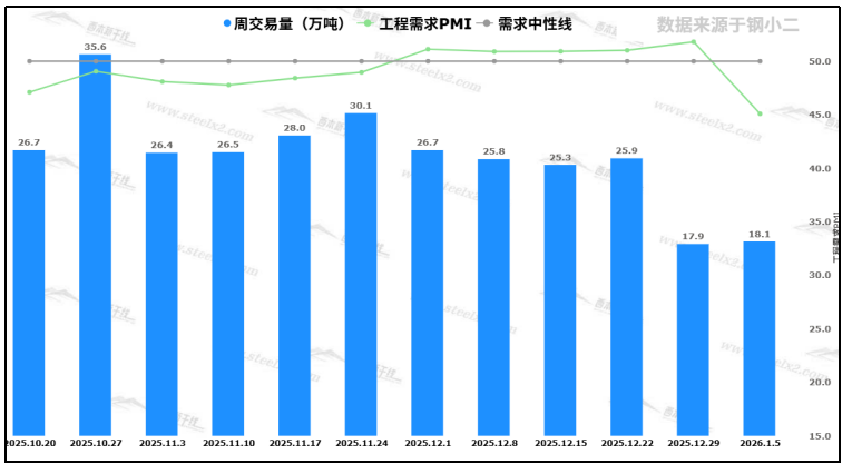 北方需求年前收尾,南方工地按需采購,市場活躍度下降,表觀需求處于低位。下周寒潮來襲,北方大部雨雪增多,南方地區(qū)降溫明顯,屆時,影響運輸和施工。據(jù)鋼小二跟蹤數(shù)據(jù)顯示,截至本周五下午15點,本周采樣全國工程需求量18.1萬噸(注:本周六和周日數(shù)據(jù)暫未錄入)。