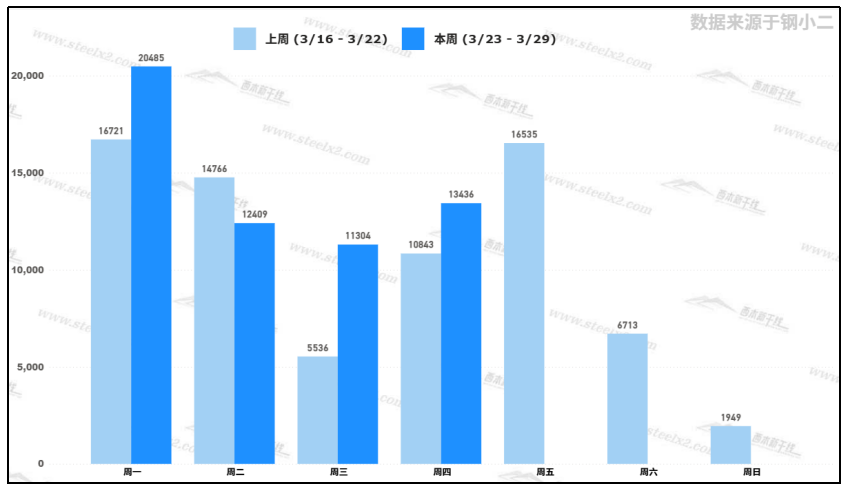 據(jù)鋼小二平臺(tái)樣本數(shù)據(jù),3月26日采樣全國(guó)工程需求量為13,436噸,較上一個(gè)交易日環(huán)比增加18%。