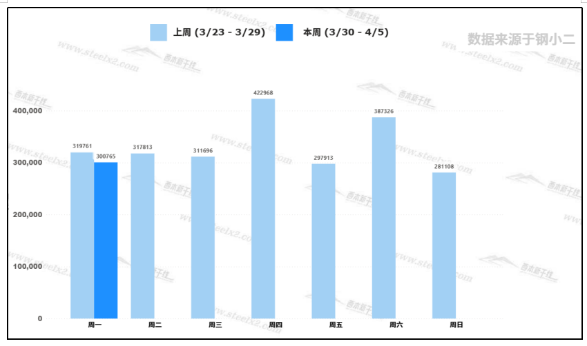 據(jù)鋼小二平臺樣本數(shù)據(jù),3月30日建筑鋼材社會庫存量為300,765噸,較上周五庫存量小幅微增。