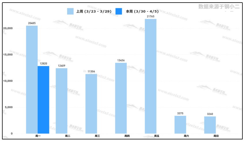 據(jù)鋼小二平臺樣本數(shù)據(jù),3月30日采樣全國工程需求量為12,820噸,較上一個交易日環(huán)比下降明顯。