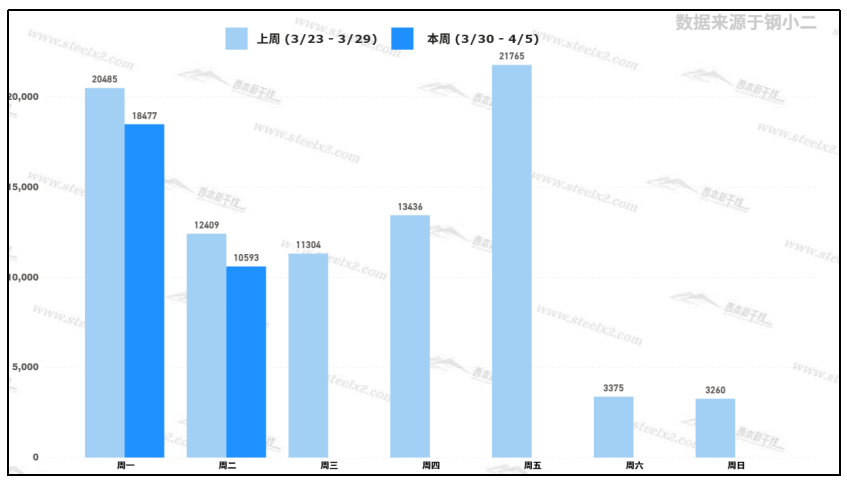 據(jù)鋼小二平臺(tái)樣本數(shù)據(jù),3月31日采樣全國(guó)工程需求量為10,593噸,較上一個(gè)交易日環(huán)比下降明顯。