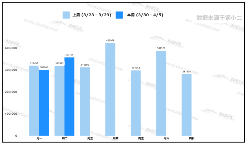 據(jù)鋼小二平臺(tái)樣本數(shù)據(jù),3月31日建筑鋼材社會(huì)庫(kù)存量為357,195噸,較上一個(gè)交易日庫(kù)存量增加。