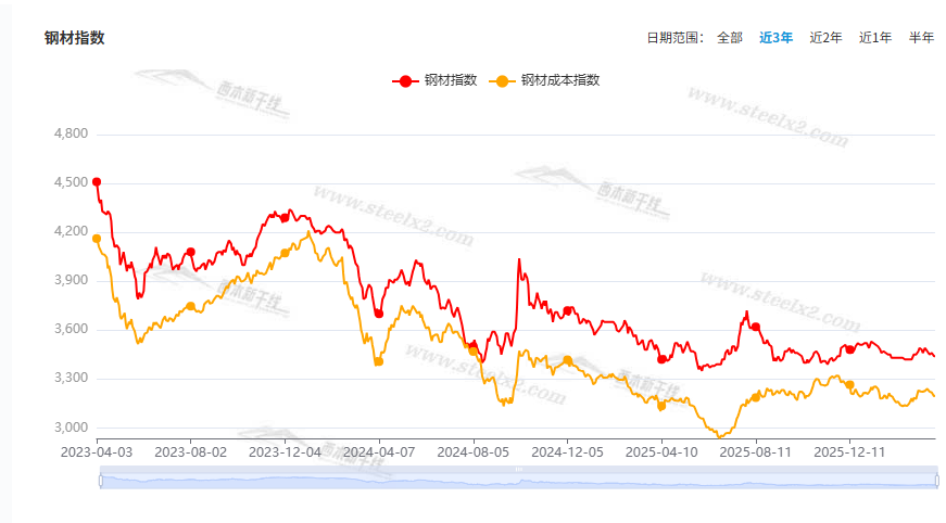 本期,全國多數(shù)市場建筑鋼材價格小幅波動:其中,北方鋼廠強勢,級差拉大;南方期現(xiàn)互動,穩(wěn)中有落。本周西本鋼材指數(shù)微調(diào),成本指數(shù)調(diào)低,顯示長流程鋼廠利潤空間略有變化;本周螺紋鋼期貨主力合約弱勢運行,對現(xiàn)貨有一定壓制。(下圖為紅色線條為鋼材指數(shù),黃色線條為成本指數(shù))