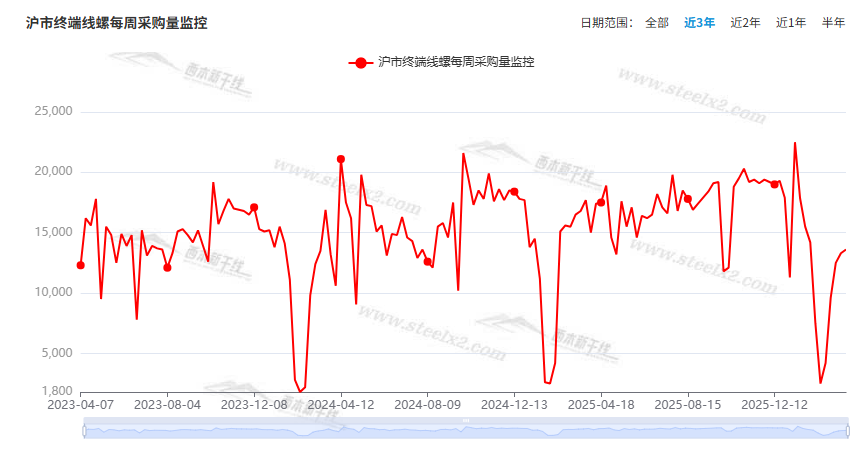 本期,西本資訊監(jiān)測的滬市線螺周終端采購量為1.36萬噸,環(huán)比前一周回升2.26%(見下圖)。本周終端需求環(huán)比略有增加,增速明顯乏力。