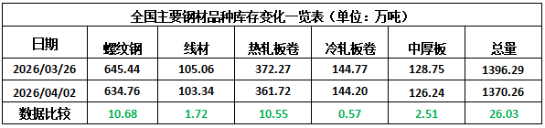 據(jù)西本資訊歷史數(shù)據(jù),當(dāng)前庫存總量較上年同期(2025年4月3日的1222.50萬噸)增加147.76萬噸,增幅為12.87%。分品種看,本期五大鋼材品種中,所有品種庫存環(huán)比下降。(見下圖)