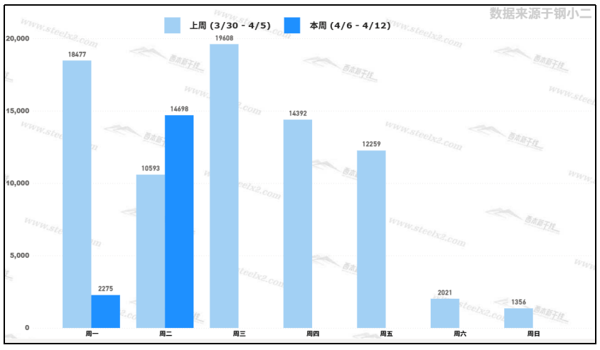 據(jù)鋼小二平臺(tái)樣本數(shù)據(jù),4月7日采樣全國(guó)工程需求量為14,698噸,較節(jié)前需求增加19%。