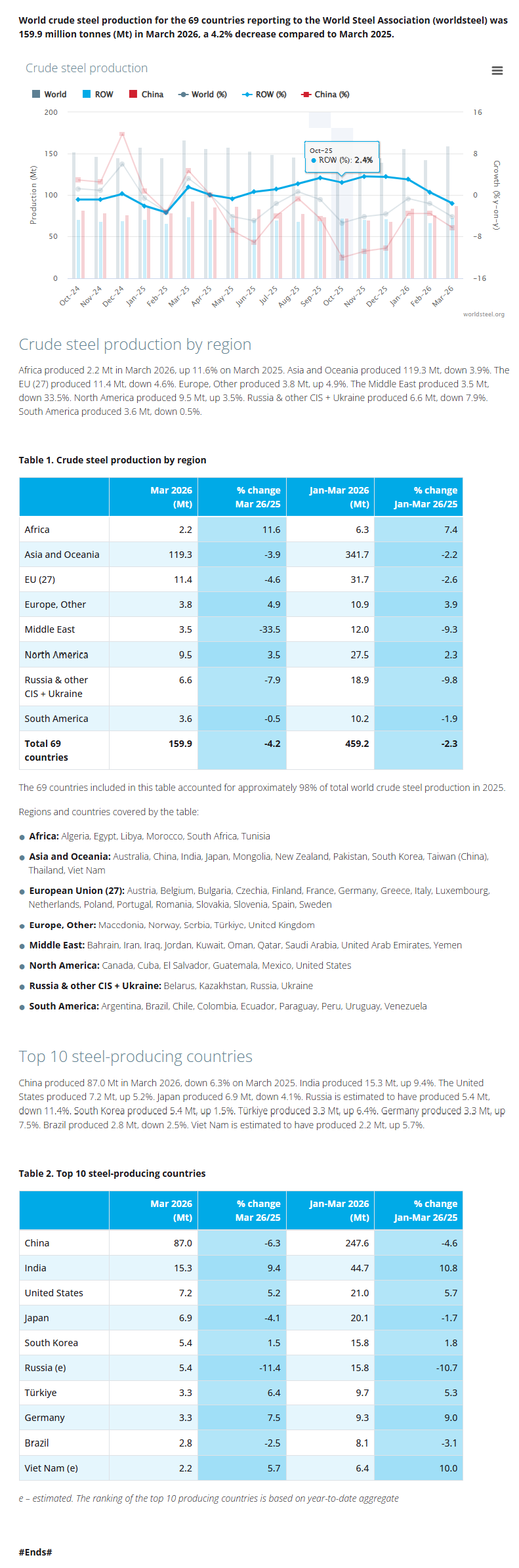 2026年3月全球69個納入世界鋼鐵協(xié)會統(tǒng)計國家/地區(qū)的粗鋼產(chǎn)量為1.599億噸,同比下降4.2%。