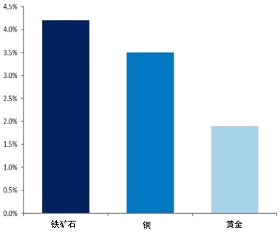 圖為原油價(jià)格上漲10%對(duì)不同礦石直接現(xiàn)金成本的影響