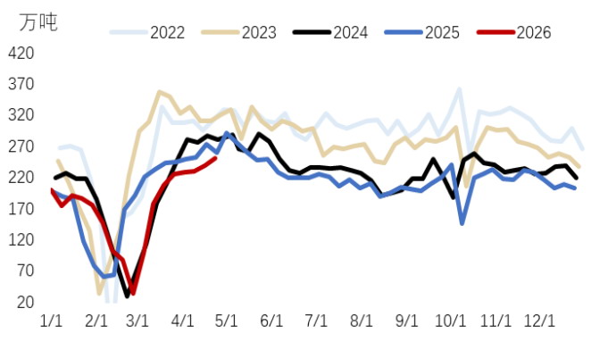 從歷史經(jīng)驗來看,上半年需求的高點大多出現(xiàn)在5月中上旬。當前螺紋鋼表觀消費量約為250萬噸,去年同期旺季峰值達292萬噸。按照今年前期需求累計降幅8.6%進行推算,今年旺季需求峰值或在267萬噸附近,表現(xiàn)消費量仍有一定上升空間。預計在需求拐點出現(xiàn)之前,基本面將繼續(xù)為螺紋鋼期貨價格偏強運行提供支撐。