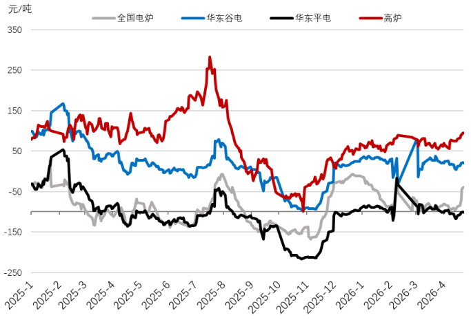 圖為螺紋鋼高爐、電爐生產(chǎn)利潤走勢
